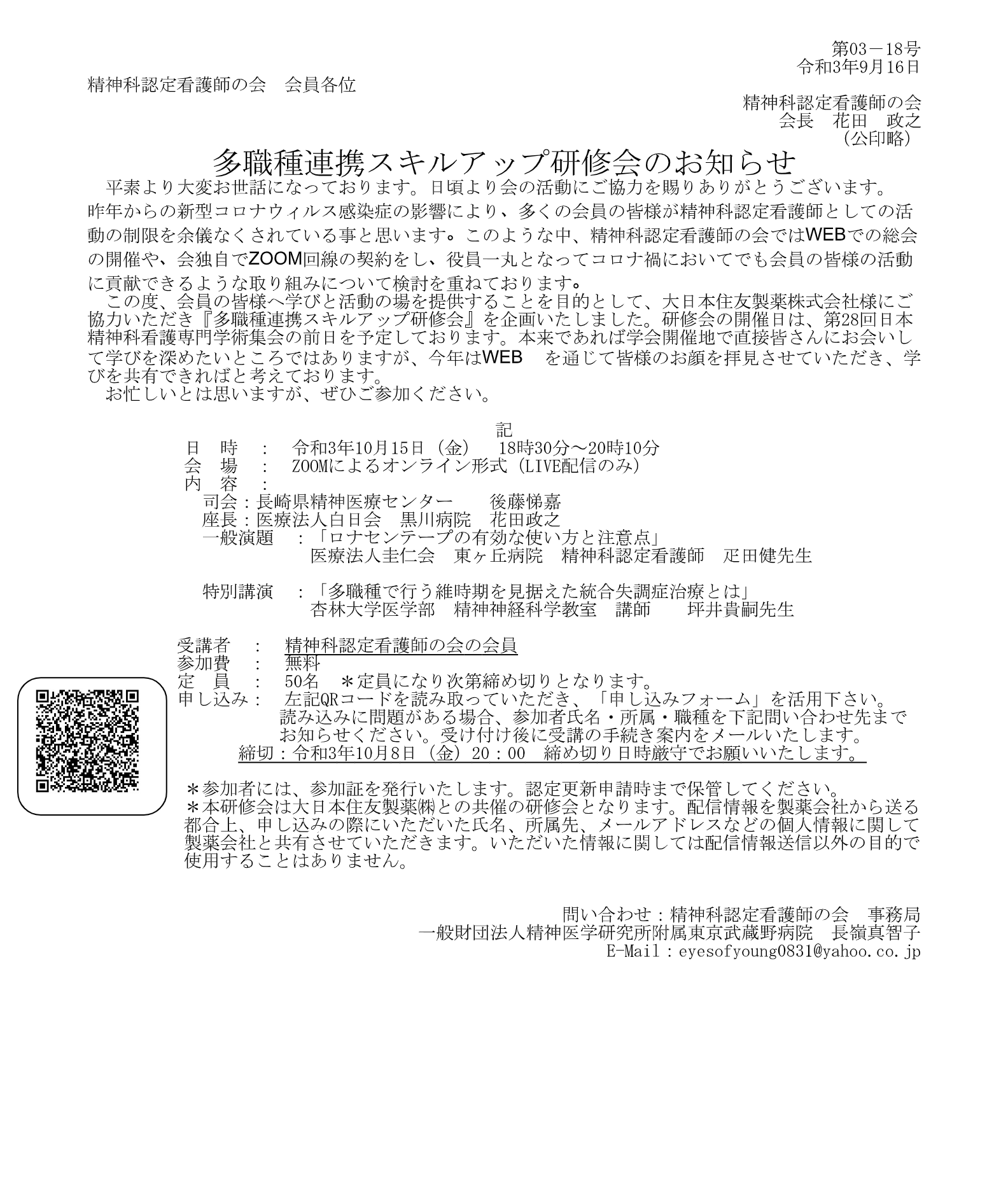 *本研修会は大日本住友製薬㈱との共催の研修会となります。配信情報を製薬会社から送る