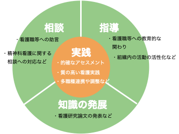 精神科認定看護師は、精神科看護の専門的知識や技術を用いて質の高い精神科看護の「実践」「相談」「指導」「知識の発展」の4つの役割を担っている。特に質の高い実践を中心に、 精神科看護の現場で起こる様々な状況に対応する力を発揮し、他部門との連携、調整役、看護城の困りごとの相談役、院内教育を活性化させるなどの活動を通して現場の精神科看護が向上することが期待される。